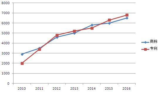 以上数据包括发明,实用新型和外观设计的专利申请数,以及商标注册的申请数。